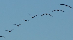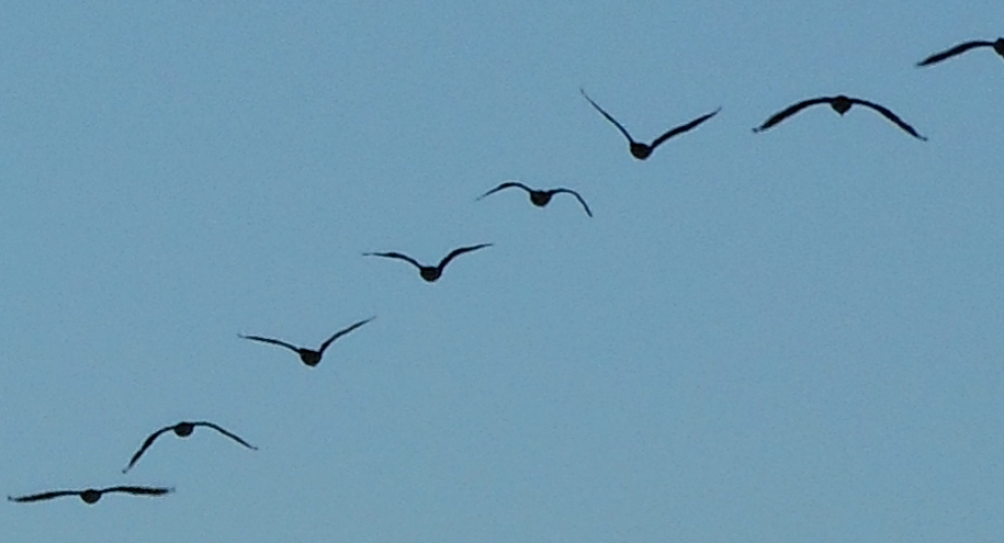 In the section of the photo to the right, the leader is at the bottom, center. In the photo below, the leader appears at the bottom, but is out front leading. The leader is not concerned with controlling the individual action of each bird, but with the overall formation that will provide efficient wind protection and lift for all to fly well. Each knows his or her script, and plays his or her individual instrument the way it needs to be played so that the final outcome is beneficial for all. Engrained in their DNA, is an understanding of how each individual action works together for the benefit of all the members of the group. They are aware of each other, they are listening to each other, and are supporting each other in maintaining the group goal, while yet being responsible for their own actions. This is Organisational Learning. Individual entities/organisms, working and learning from each other for the good of the whole.